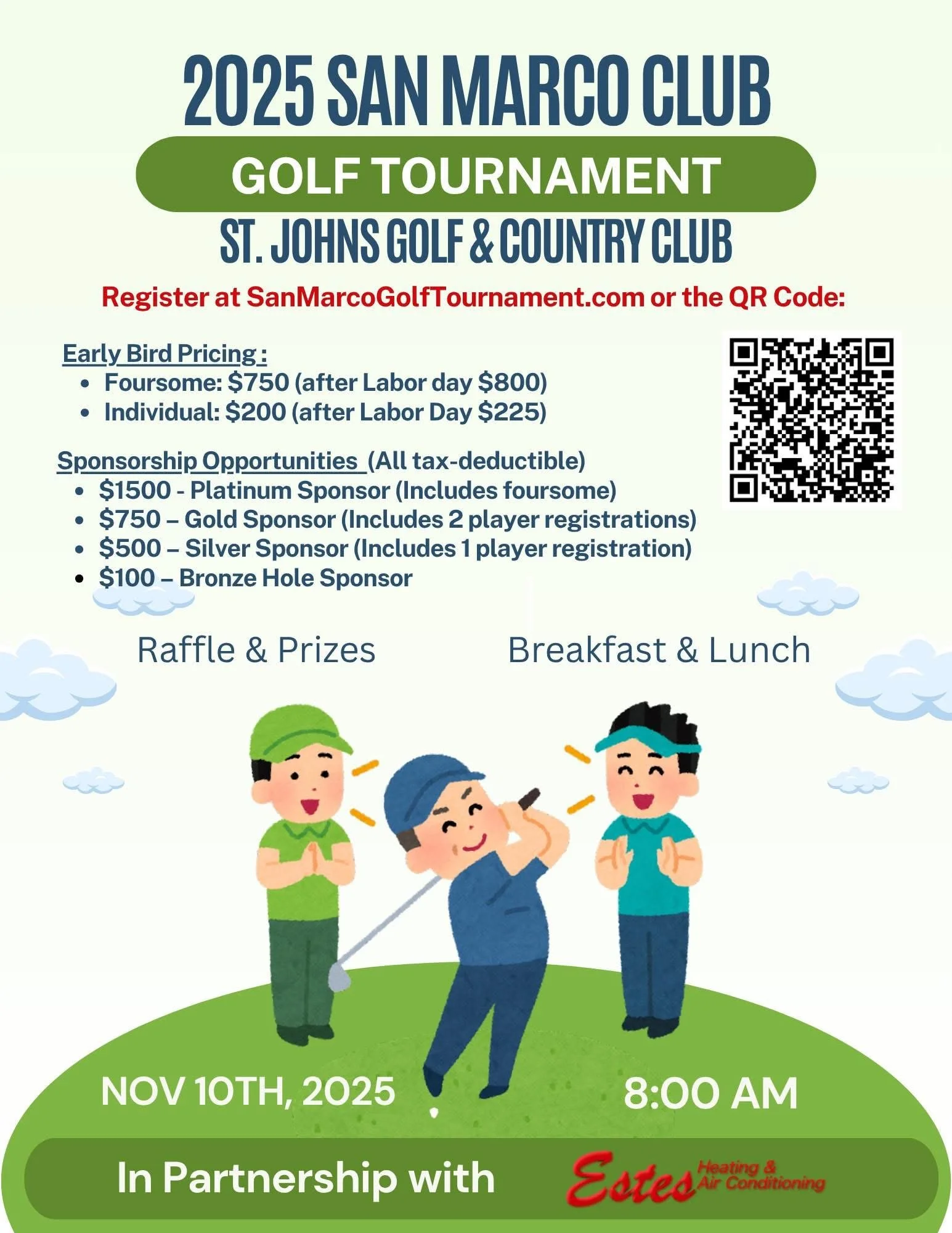 Swing into action and support the San Marco Club at our 2025 Golf Tournament—set to be one of the very first events played at the newly renovated St. Johns Golf & Country Club, reopening after a 4.5-month transformation that began in May 2025!